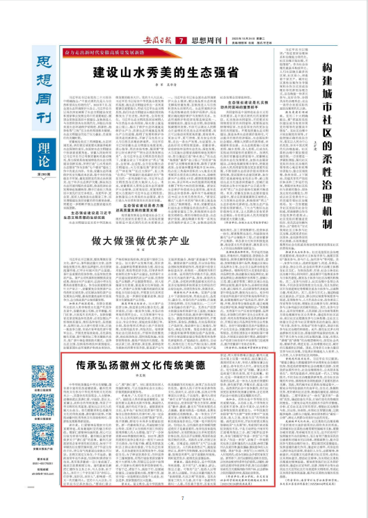 在政策建言领域,智库打通“市-省-国家”多层级转化渠道。旅游学院张俊香撰写的《黄山市数字创意产业发展白皮书》获市政府主要领导批示,被转相关部门研究落实,近两年来其4份资政报告先后得到市领导肯定;教育科学学院于丰园的《黄山市特色新型智库建设的对策研究》获黄山市领导批示,结合国家社科基金项目提出制度创新、人才培养创新等路径建议;省级层面,朱红兵、金声琅、李瑛等教师的《新质生产力视域下大黄山旅游人才高质量培养路径》《多元创新精准布局推动大黄山文旅演艺产业高质量发展》《“苏超”破圈对安徽文旅融合发展的启示》等研究被《安徽省情》刊载;李铁范、姜红、郭宏斌撰写的《擦亮徽州文化“金名片”让徽州文化“活起来”“火起来”》获省领导批示,为全省徽州文化保护传承提供参考;国家层面,学校与安徽大学舆情与区域形象研究中心(中宣部直报点)合作,多篇深度咨政报告被中央有关部门采用,姜红参与撰写的《“新一轮民营经济的春天来了”——舆论场热议习近平总书记出席民营企业家座谈会并发表重要讲话》,舆情写作小组刘罗玉、郭宏斌等撰写的《谷爱凌天价训练经费引舆情关注》《2025“两会”媒体报道与传播综述》,为中央决策提供重要支撑。此外,郭宏斌还参与中宣部中央马工程重点课题《习近平文化思想的安徽实践研究》,负责案例报告《打牢社会治理的文化根基——中华优秀传统文化赋能基层治理的安徽实践》撰写工作,成果已报送中宣部理论局。
