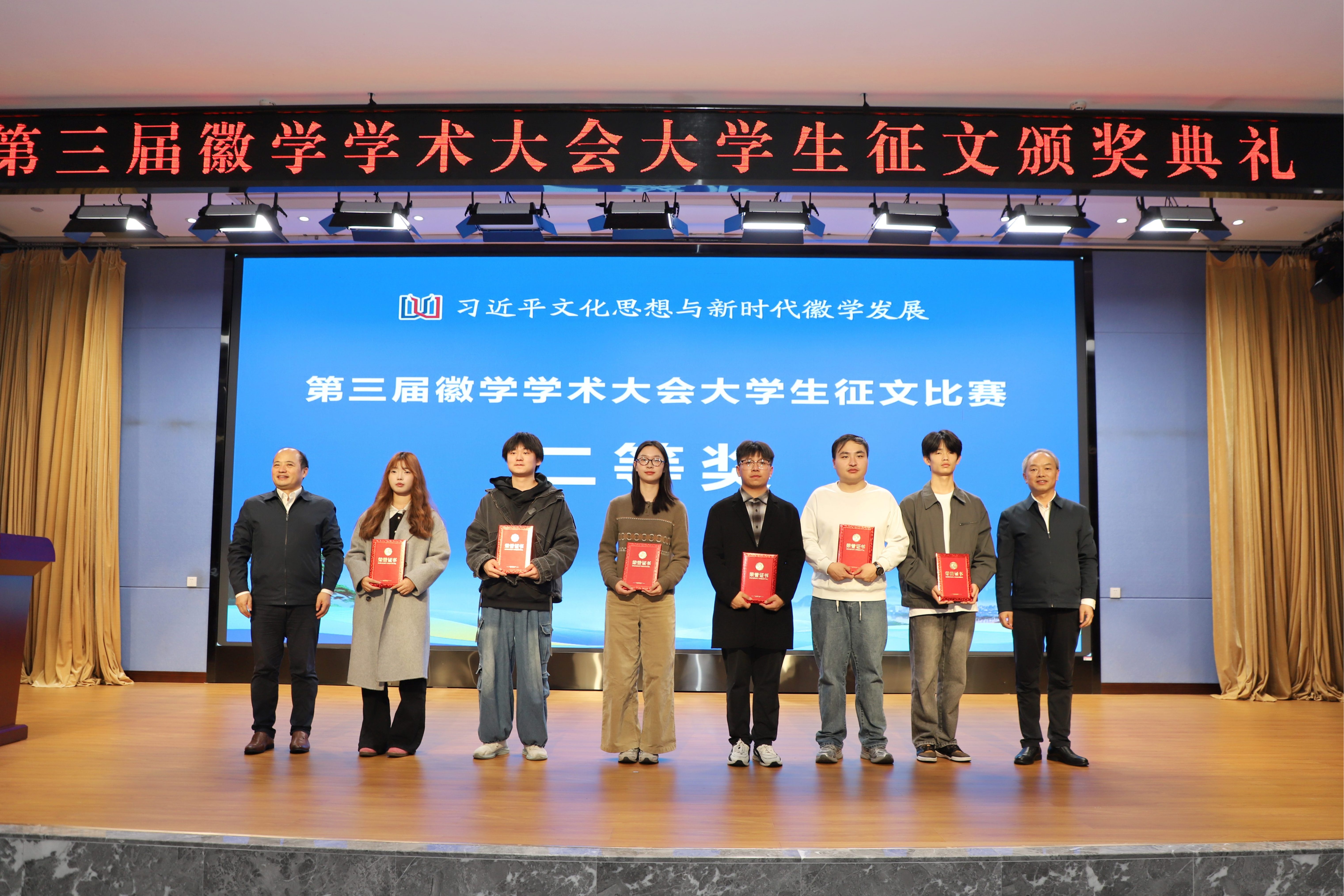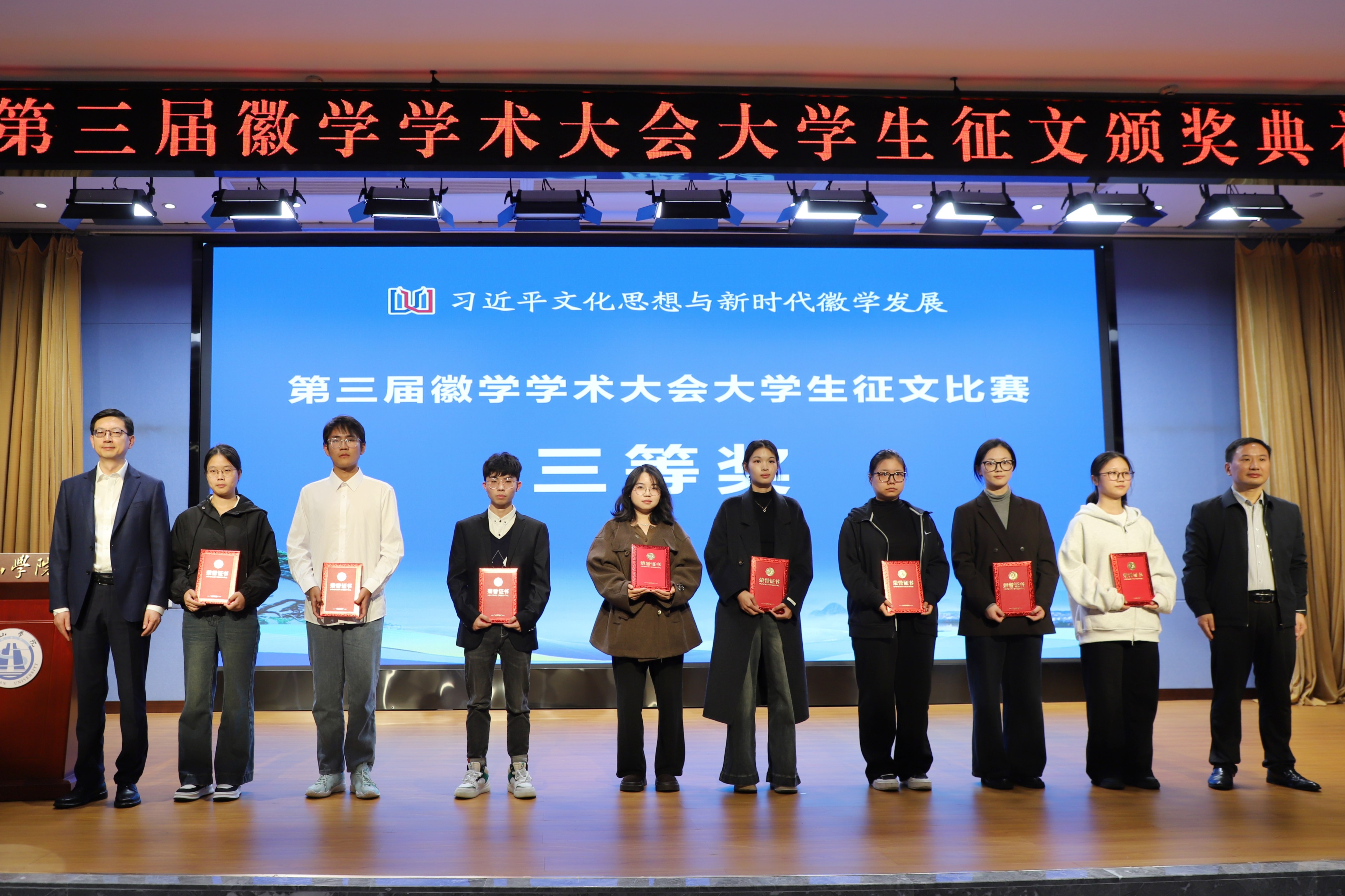 典礼上,与会领导嘉宾为第三届徽学学术大会大学生征文比赛获奖代表颁奖。复旦大学的黄雨晨、黄山学院的张丰瑞、安徽大学的廖锦清、安徽师范大学的许雪昕代表获奖者发言。