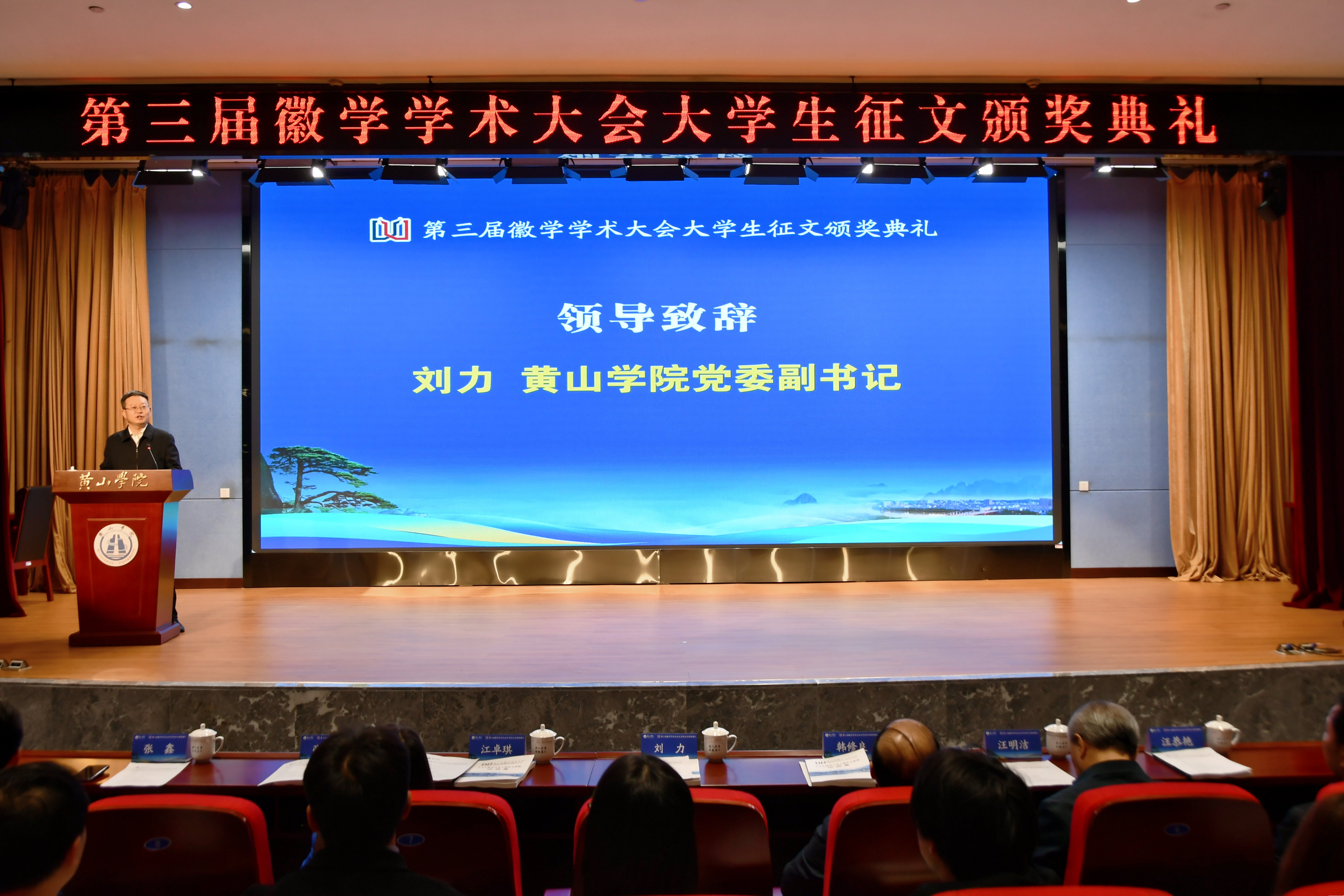 11月8日上午,第三届徽学学术大会“我眼中的徽州与徽州文化”大学生征文颁奖典礼在我校文博楼二楼报告厅举行。校党委副书记刘力,党委委员、副院长张小明,黄山市人民政府副市长江卓琪,省社科联秘书长韩修良,黄山市社科联党组书记、主席汪明洁,安徽大学徽学研究中心总支书记张鑫出席典礼。获奖学生代表、黄山学院师生代表参加典礼。典礼由张小明主持。